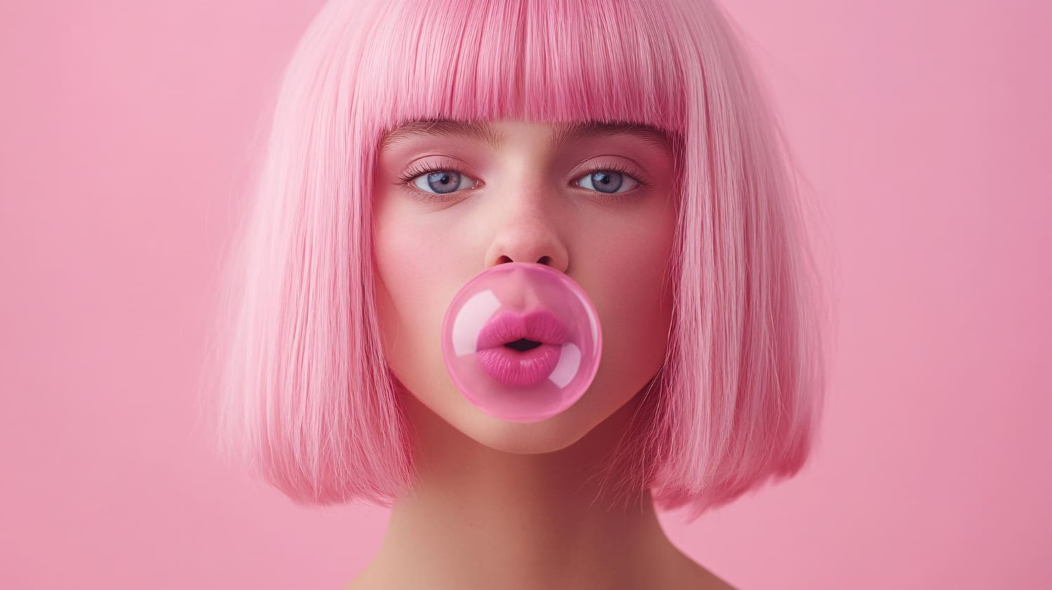 A girl with pink hair and bubble gum